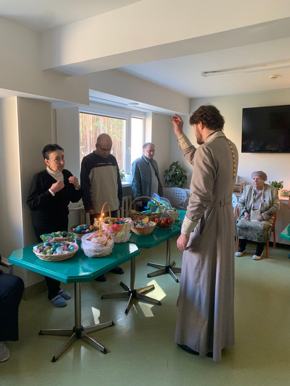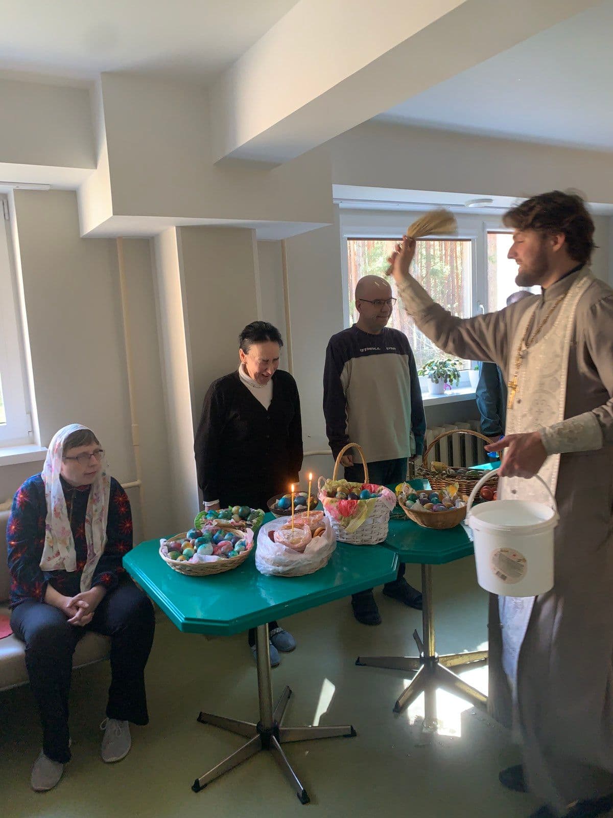 Preester pidas palve ja piserdas toodud ande püha veega. See iidne kiriklik komme meenutab lihavõttepühade vaimset tähendust — elu võitu surma üle, valguse võitu pimeduse üle.