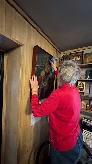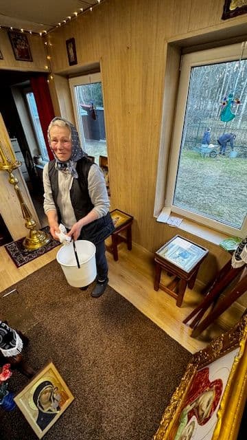 Töid tehti nii sees kui väljas. Kirikus viidi läbi põhjalik koristus: puhastati ikoone, kirikuriistu ja klaaspindu, korrastati seinad ja mööbel. Erilist tähelepanu pöörati pühade esemete austavale hooldamisele — iga detaili käsitleti hoolikalt ja lugupidamisega.